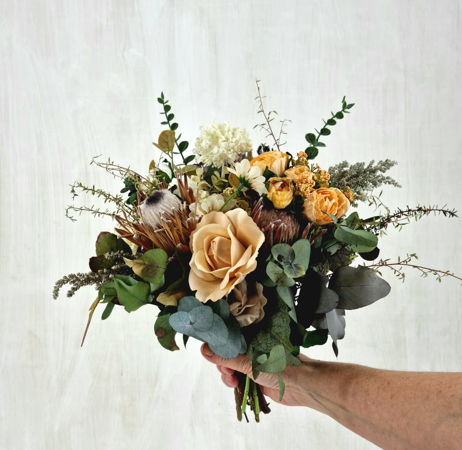 Flowergirl bouquets are thoughtfully created in New Zealand using preserved foliage and silk florals for lasting natural beauty.