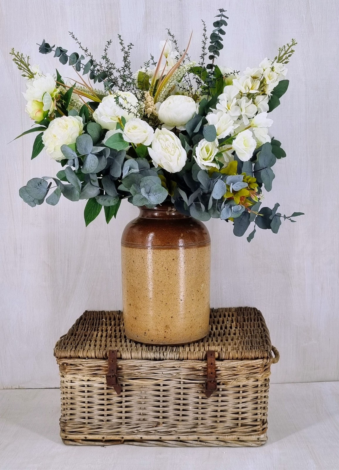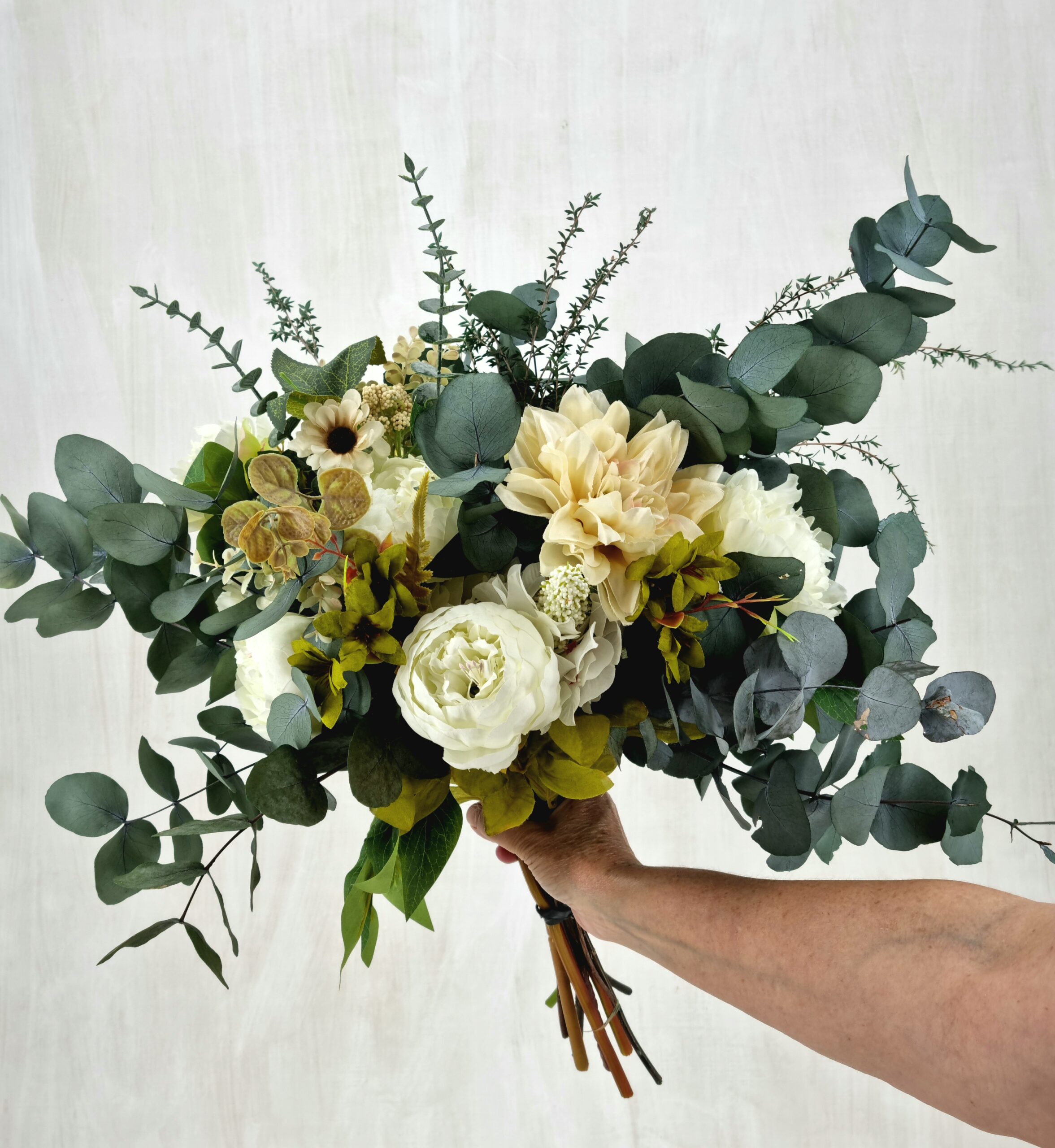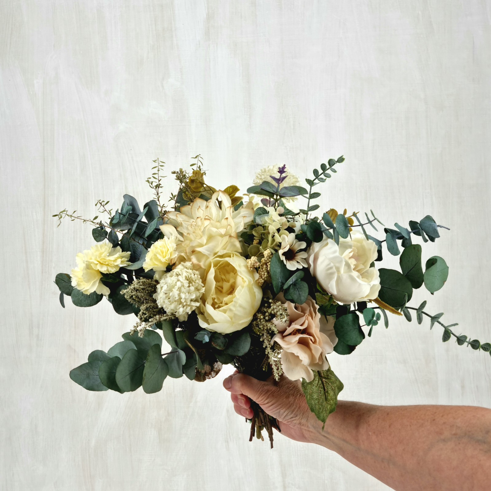An everlasting bouquet created with preserved foliage and silk florals in ivory, cream, and soft green tones. Designed to bring lasting natural beauty to your home or to make a thoughtful gift.