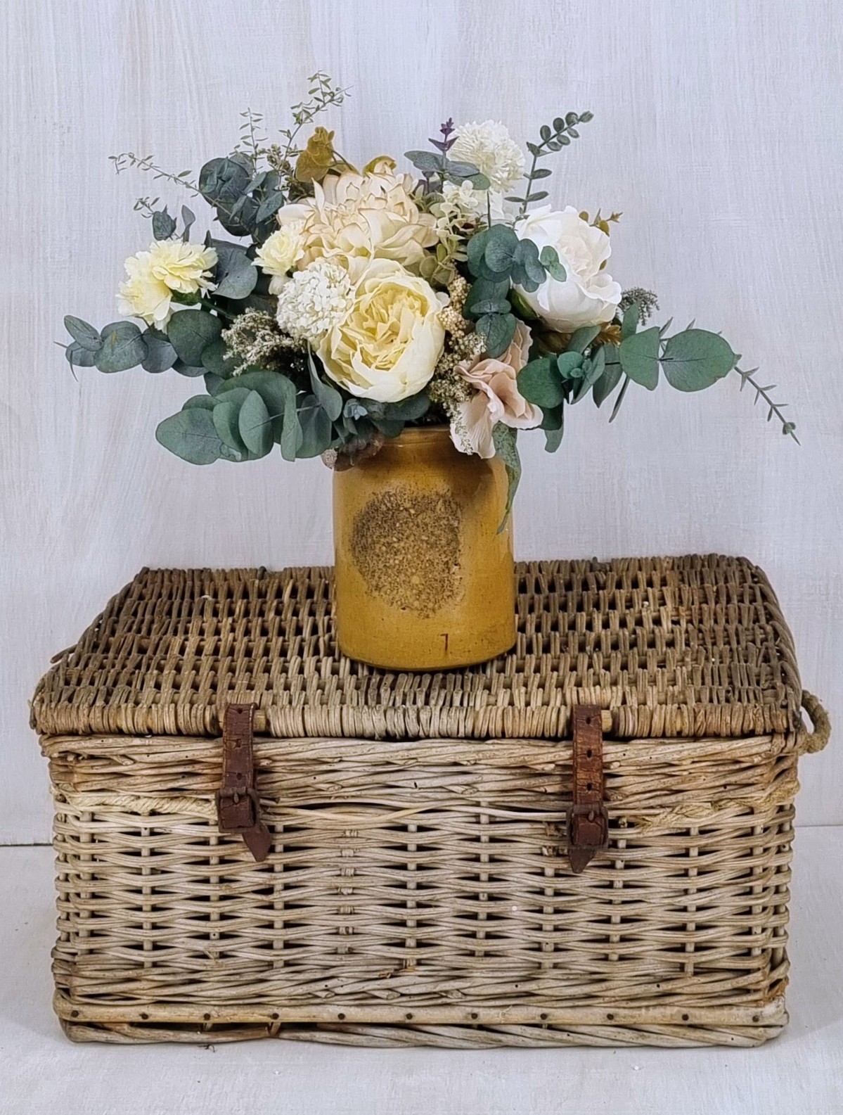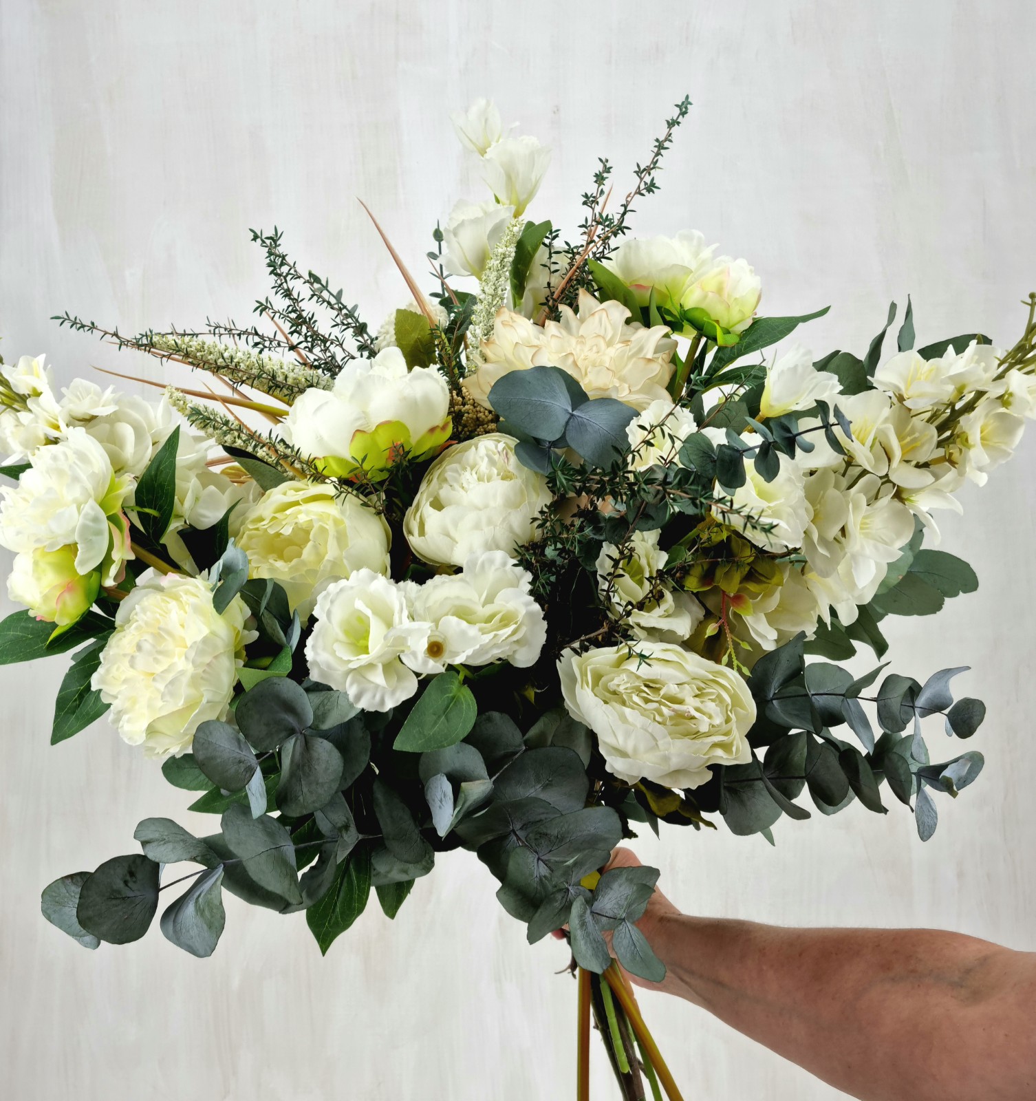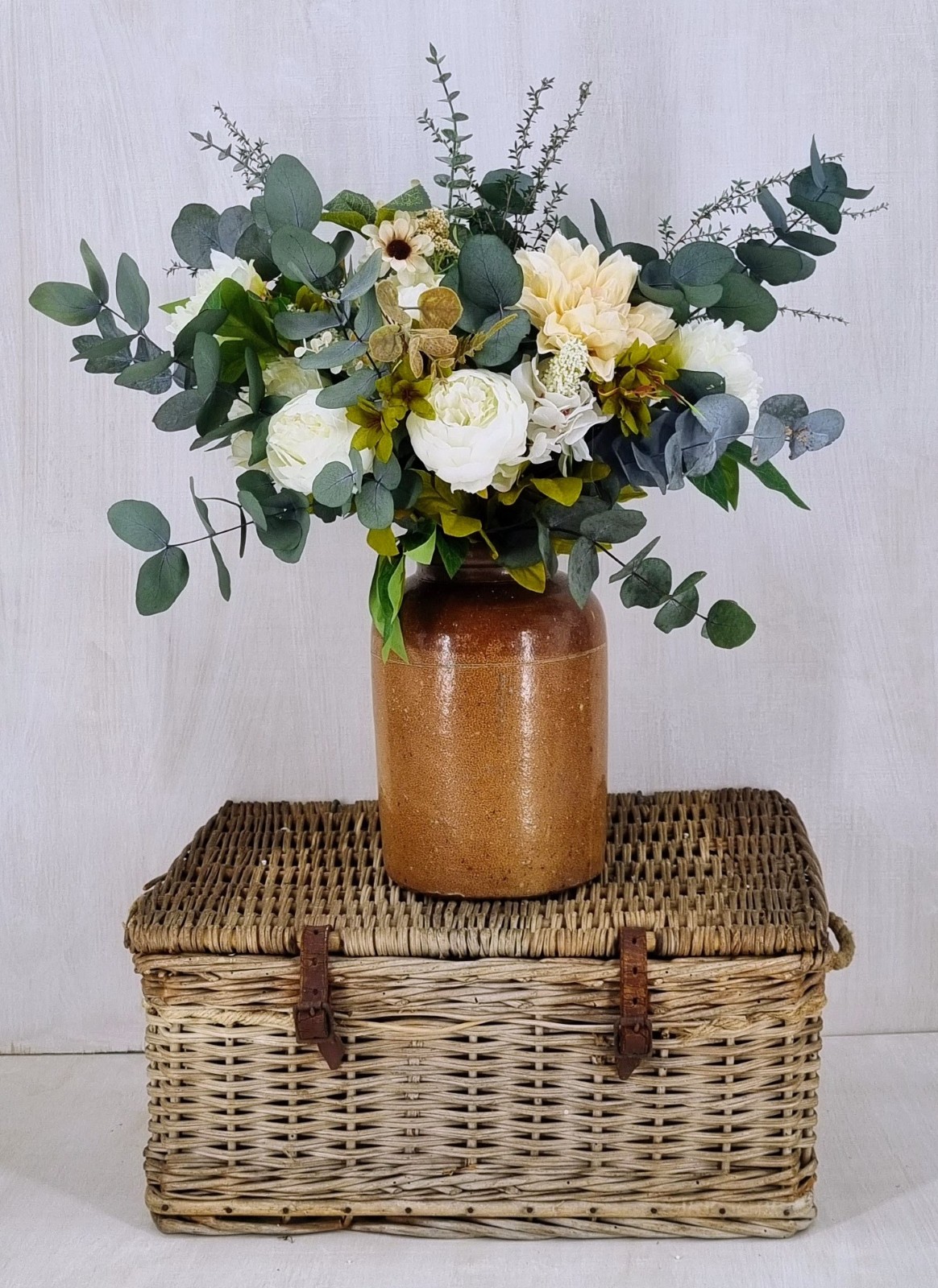 An everlasting bouquet created with preserved foliage and silk florals in ivory, cream, and soft green tones. Designed to bring lasting natural beauty to your home or to make a thoughtful gift.